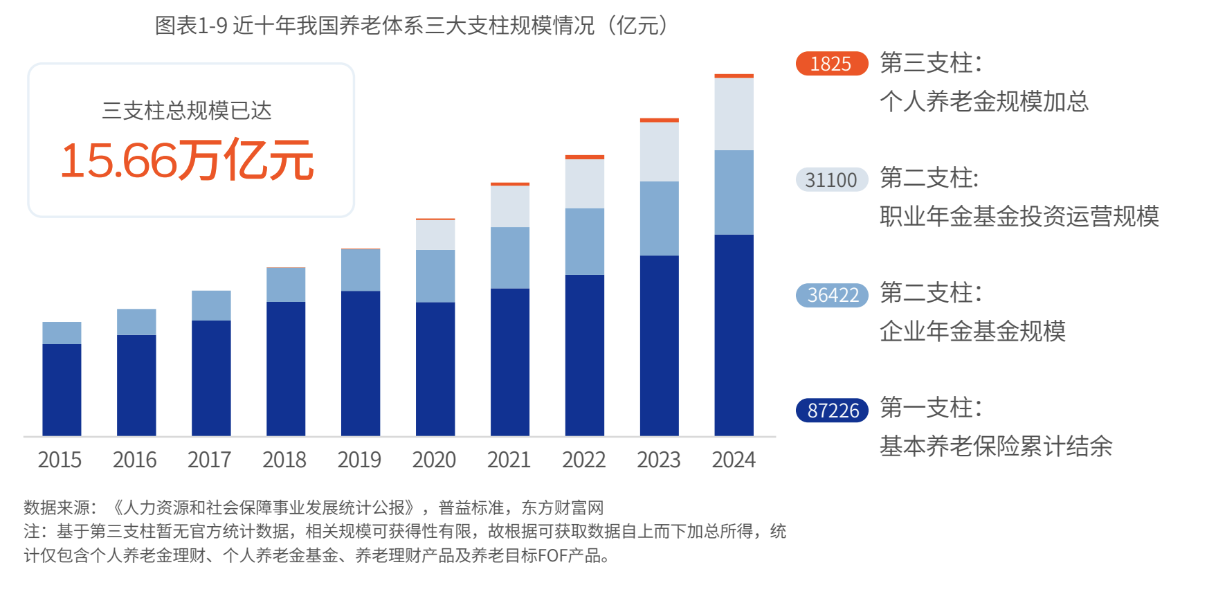 2024年,个人养老金制度全面推行,初步形成以账户制为核心、多类产品协同发展的多层次养老金融产品体系。目前,我国已经初步建立起包含第一支柱基本养老保险、第二支柱职业养老金和第三支柱个人养老金在内的三支柱养老金体系。